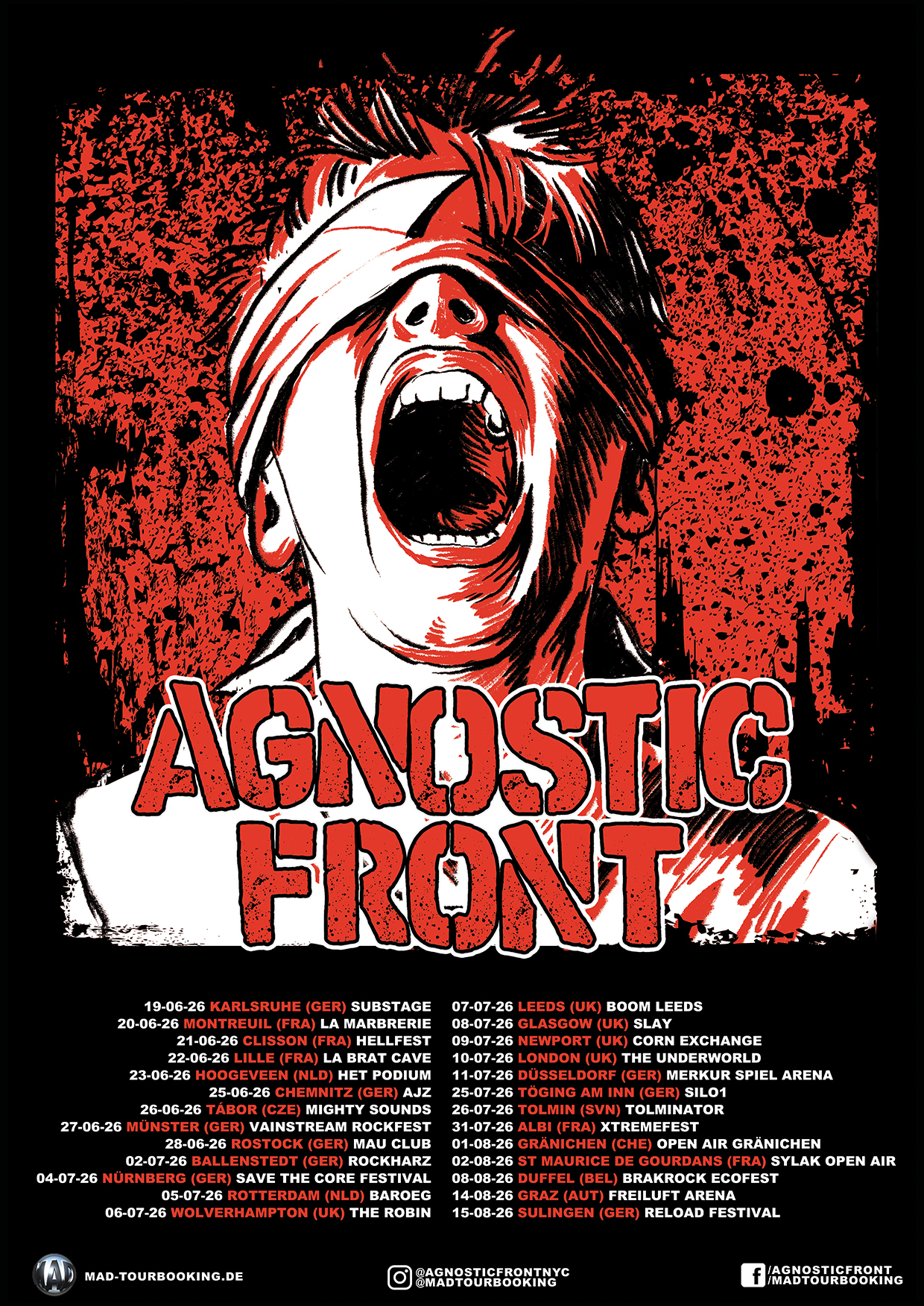 Agnostic Front will be back again in Feb . Catch them on the following dates trough Europe! This will be their record release tour for “Echoes In Eternity” is a raging, 15-track assault that blends blistering hardcore punk with hard-earned wisdom. The album includes the politically charged ‘Way Of War,’ the unifying pit anthem ‘Turn Up The Volume,’ and ‘Matter Of Life & Death,’ a crossover explosion featuring hip-hop legend Darryl “DMC” McDaniels. Lyrically, the band tackles war, betrayal, oppression, personal struggle, and defiance with unflinching honesty.